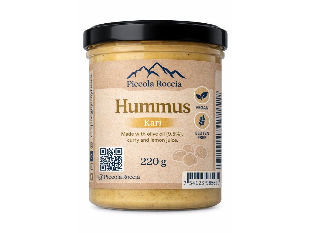 Složení Hummus Kari: Cizrna, tahini (sezamová pasta), olivový olej, konfitovaný česnek, citrón, římský kmín, kari pasta, sezamový olej, sůl.